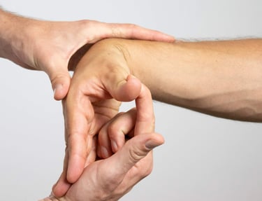 - WHAT test (Wrist Hyperflexion & Abduction of the Thumb) (imagen 2): El paciente realiza flexión de muñeca + abducción del pulgar (o el examinador aplica resistencia). Si aparece dolor en la zona del pulgar/muñeca, se considera positiva